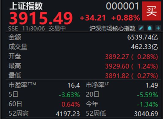 3月25日,A股高开高走,沪指复原3900点。落幕上昼收盘,上证指数涨0.88%报3915.49点体育游戏app平台,深证成指涨1.37%,创业板指涨1.26%,北证50涨1.04%,科创50涨1.08%,中证A500涨1.14%,A股半日成交1.48万亿元。