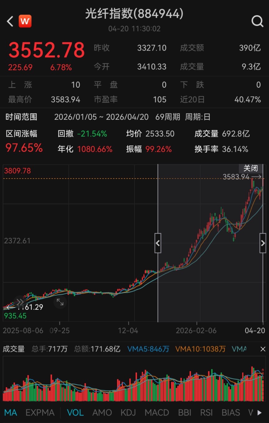 4月20日,A股光纤板块全线爆发,通鼎互联收成3天2板,龙头企业中天科技(600522)强势涨停,早盘收报30.95元;远东股份跟涨,截止午间收盘涨超5%。