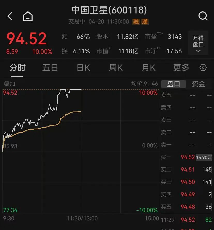 盘面上,营业航天观点发达活跃,中国卫星、西部材料、中衡联想等多股涨停。光纤观点快速拉升,通鼎互联(002491)收成3天2板,开盘仅用不到1分钟时期涨停,中天科技涨停。