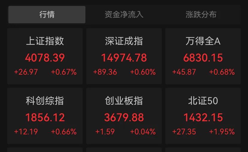 4月20日早盘,A股市集震憾拉升,全市集逾3300只个股飘红。截止午间收盘,上证指数报4078.39点,涨0.67%;深证成指报14974.78点,涨0.60%;创业板指报3679.88点,涨0.04%;科创综指报1856.12点,涨0.66%。