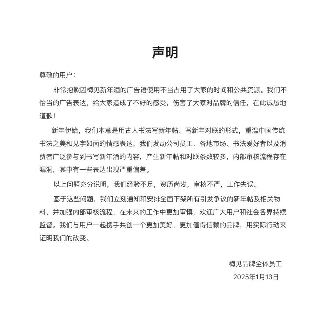 “以上问题充分说明,品牌方警戒不及,经验尚浅,审核不严,责任伪善。基于这些问题,企业坐窝见告和安排全面下架通盘激勉争议的新年帖及关连物料,并加强里面审核历程。”梅见在致歉信中进一步暗示。