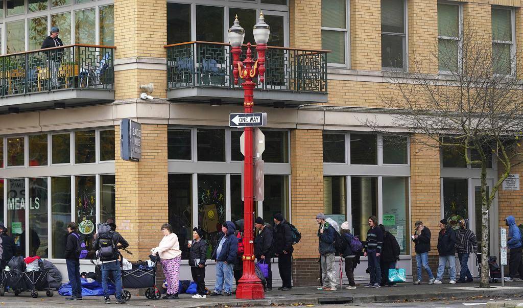 11月4日,在好意思国俄勒冈州波特兰,恭候领取免费食物的东说念主们在街头排起长队。新华社记者吴晓凌摄